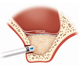 Beim indirekten Sinuslift vertieft der Implantologe den reduzierten Knochen vor dem Setzen des Zahnimplantats mittels einer minimalinvasiven Vorgehensweise durch den Bohrkanal. Danach kann das Implantat in die Bohrung eingeschraubt werden und damit den Knochenaufbau verschließen.